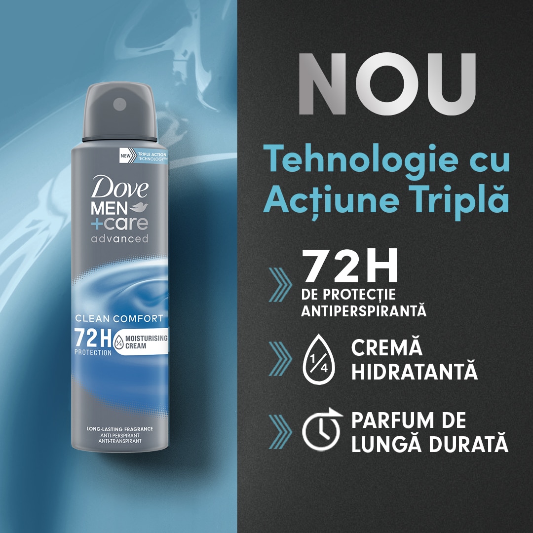 Mulțumită Tehnologiei cu Tripla Acțiune, Dove Men+Care Advanced Clean Comfort te protejează împotriva transpirației până la 72 de ore, îți hidratează pielea subrațului și asigură o senzație de curat, ce durează întreaga zi.