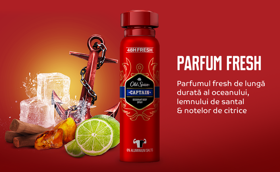 Incepe fresh. Incheie barbatesc cu rutina de prospetime Old Spice! Cu ambitia ta naturala ai lumea la picioare, iar Old Spice Captain aduce tinuta de gala cu un parfum suav si sociabil care nu a auzit de 'faux pas' (a da gres).
