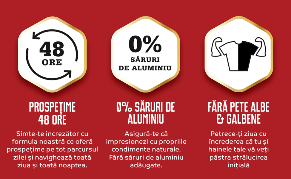 Anti urme albe si pete galbene. Actioneaza ca un scut protector impotriva urmelor albe si a petelor galbene si ofera o prospetime de lunga durata pe care toata lumea o doreste.
