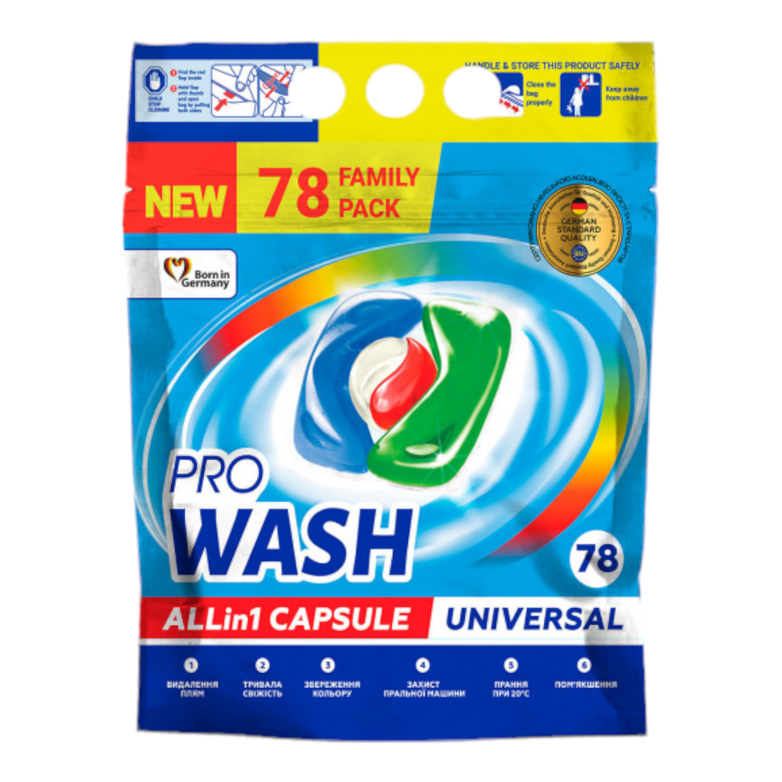 PROWASH Detergent Capsule Allin1 Universal transforma spalarea hainelor intr-o experienta usoara si eficienta.