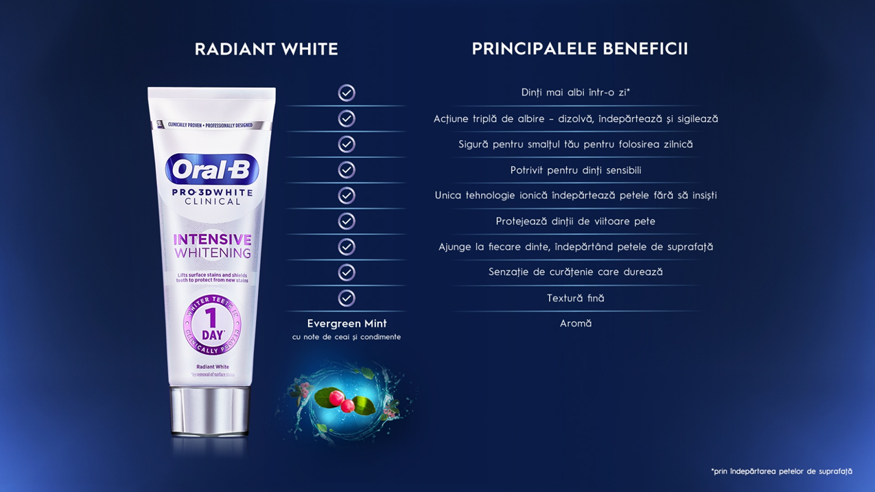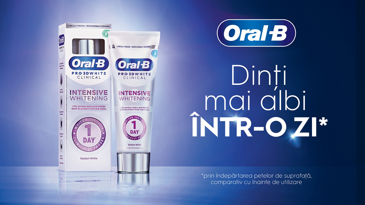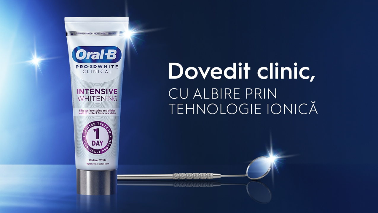 Pasta de dinti Oral-B Pro 3D White Clinical Albire intensa este cea mai buna pasta de dinti pentru albire de la Oral-B, datorita tehnologiei sale unice ionice.