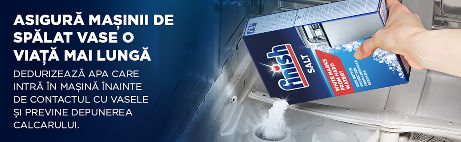 Apa dura poate lasa urme de calcar pe vesela dumneavoastra si, in timp, acestea se pot depune pe componentele ascunse ale masinii de spalat vase - reducandu-i eficienta. Sarea speciala Finish este conceputa special pentru masinile de spalat vase, pentru dedurizarea apei si protejarea masinii de efectele negative ale apei dure. Aceasta este recomandata in locul sarii de masa normale, care poate contine contaminanti ce va pot deteriora masina de spalat vase. Datorita puritatii sale ridicate, Sarea speciala Finish asigura o protectie cu 100% mai eficienta a masinii de spalat vase impotriva reziduurilor de calcar*.