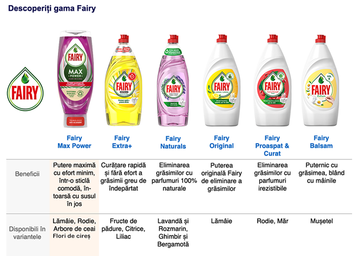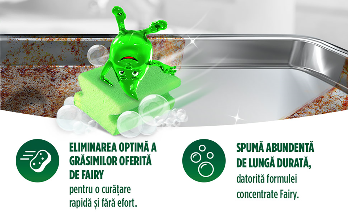 Pentru o curatare impecabila, Fairy indeparteaza grasimea si murdaria dificila, asigurand o spalare rapida. O singura picatura creeaza spuma suficienta pentru ca vasele sa fie curate si impecabile.